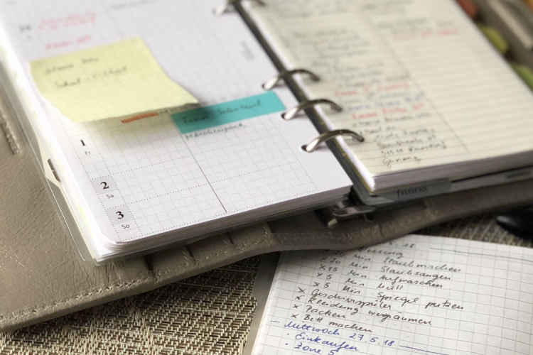 Ich habe mir eine Inbox angelegt. Hier kommt ALLES erstmals hinein. Dort schreibe ich einmal alles auf. Mein Sammelkübel sozusagen. Jeder noch so kleine Gedanke, alles auf diesen Zettel/in dieses Buch. Dieses Buch habe ich auch immer mit. Während mein Büroplaner im Büro bleibt, habe ich dieses Büchlein immer dabei. Auch falls mir zuhause etwas einfällt.