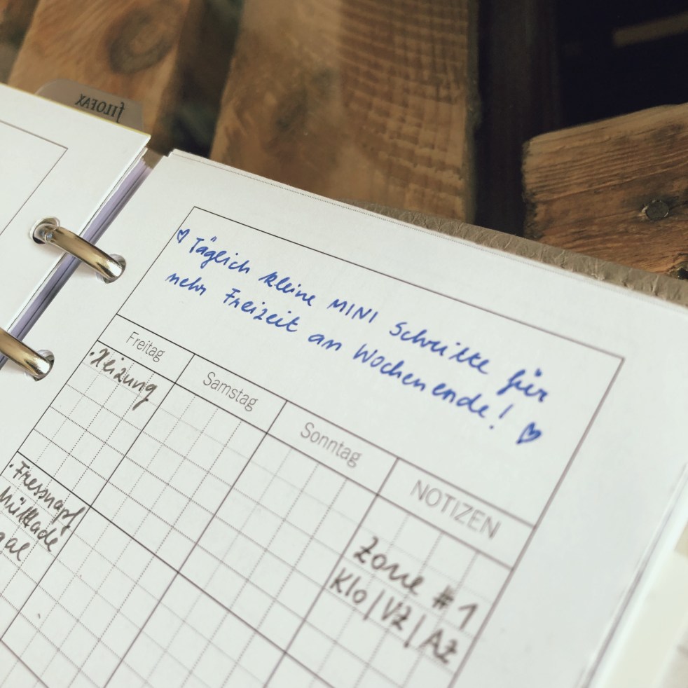 Ich habe mir die Dinge etwas anders eingeteilt. Da wir einen Hund haben, ist es mir ein Bedürfnis, einfach gründlicher Staub zu saugen.. in allen Räumen.. Oder Prospekte schmeiße ich mittlerweile täglich weg, da es 2 Minuten dauert und Teil meiner Abendroutine ist. Also fällt dieser Punkt komplett weg.