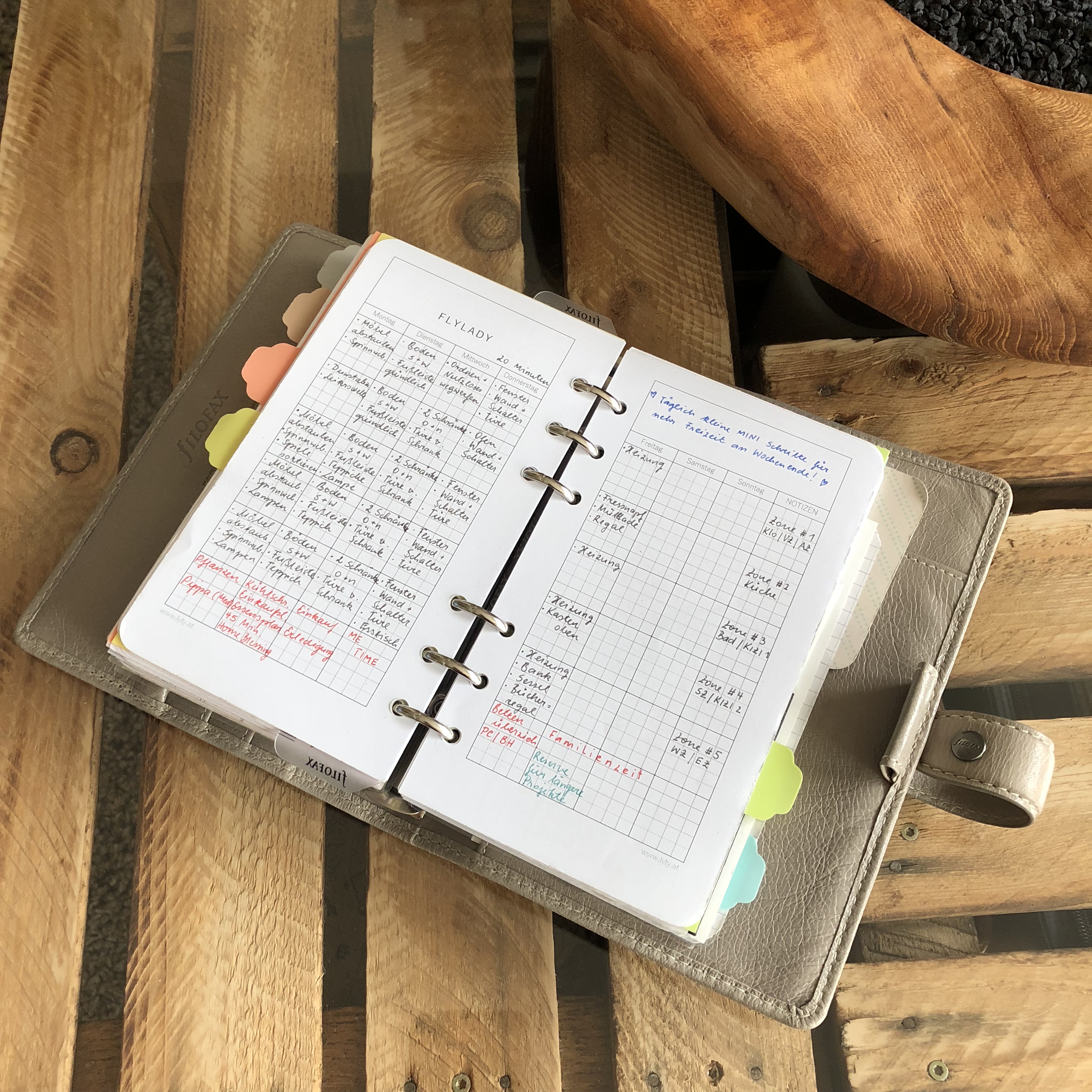 Die Zone 1 sind für mich „Nebenräume“. Das Klo ist in meiner Morgenroutine enthalten und abstauben ist in den 20 Minuten HomeBlessing integriert. Ebenfalls der Boden aufwaschen und saugen. Das geht sich aus. Wenn also in diesen Zonen Montag und Dienstag ausfällt, ist es kein „Sauberkeitsproblem“.