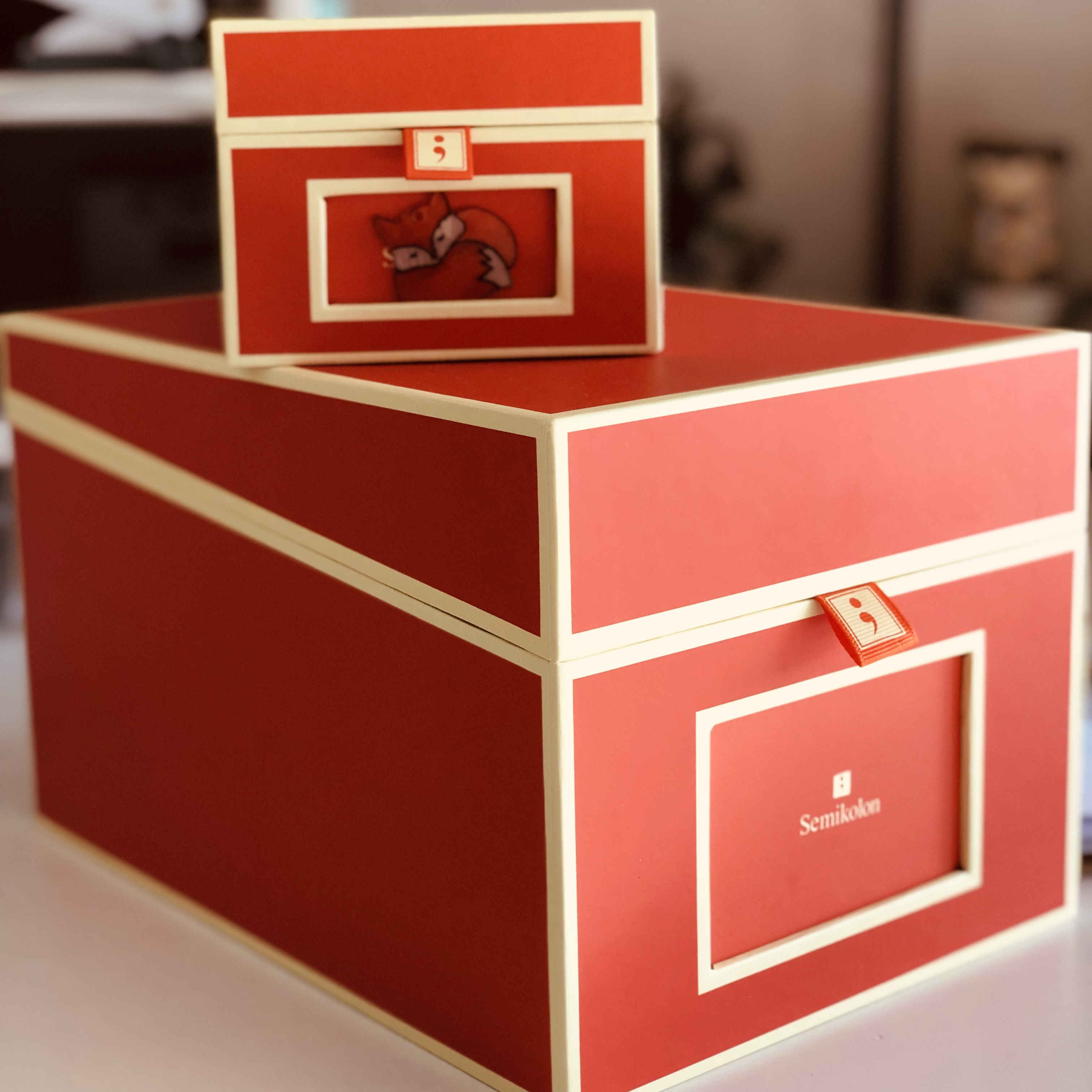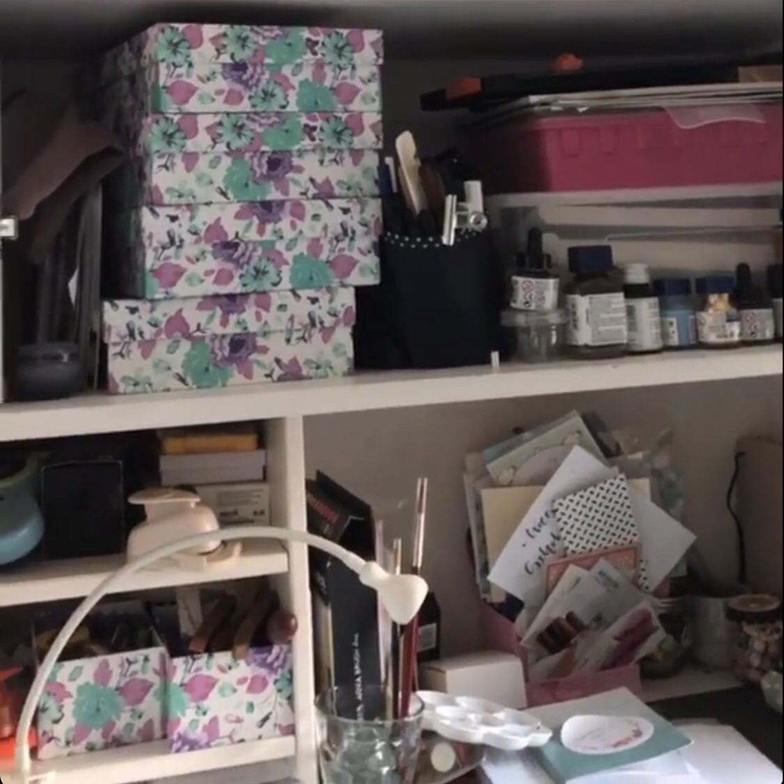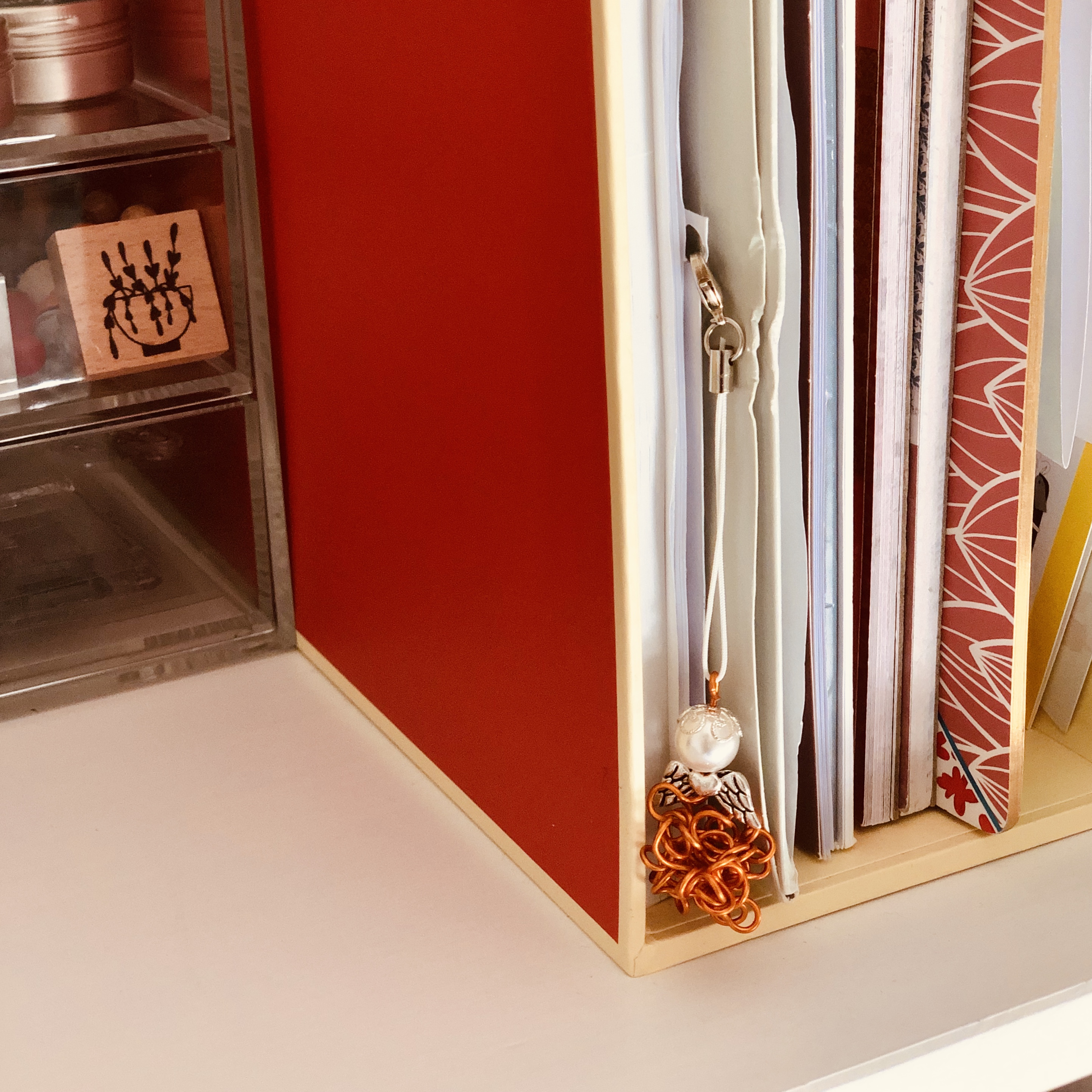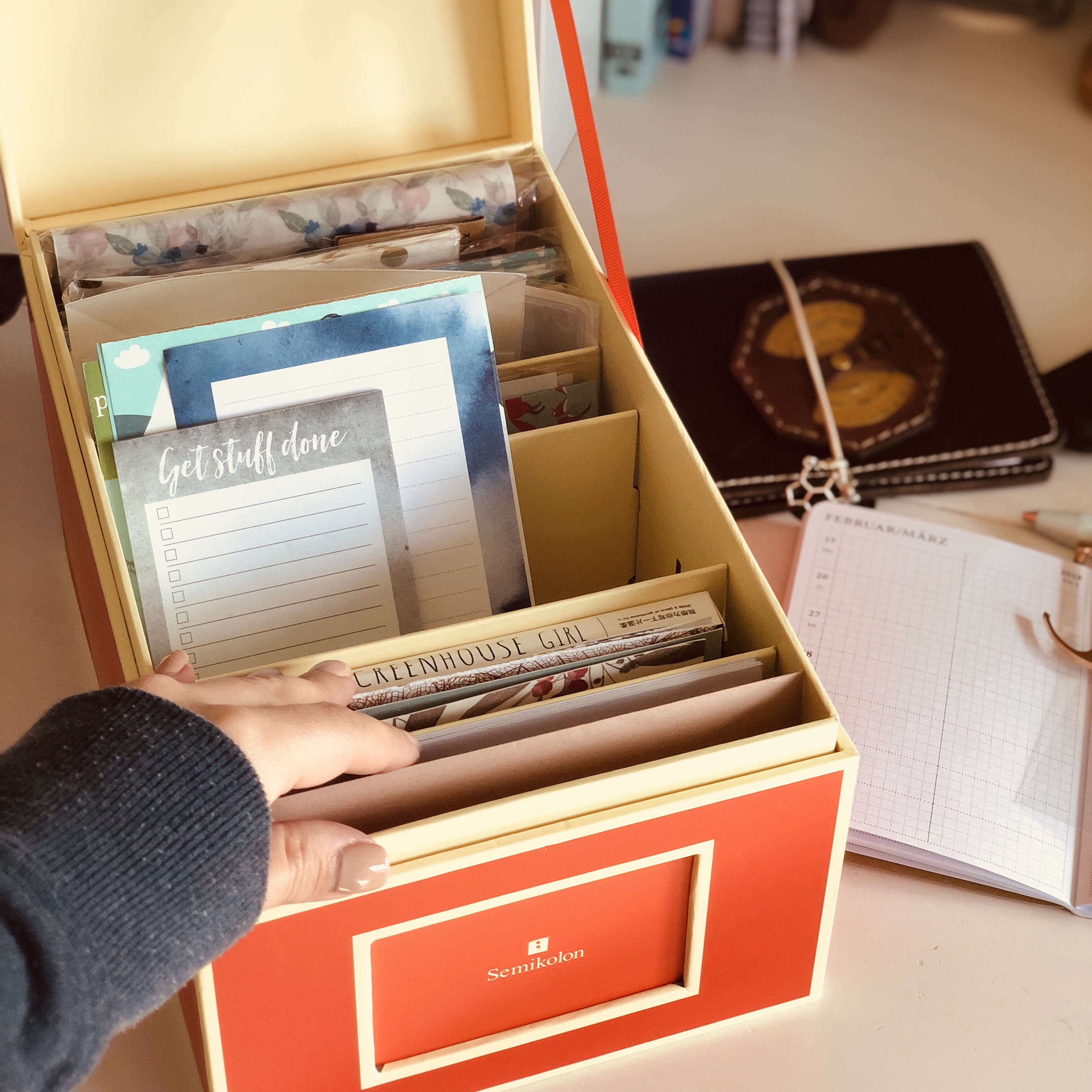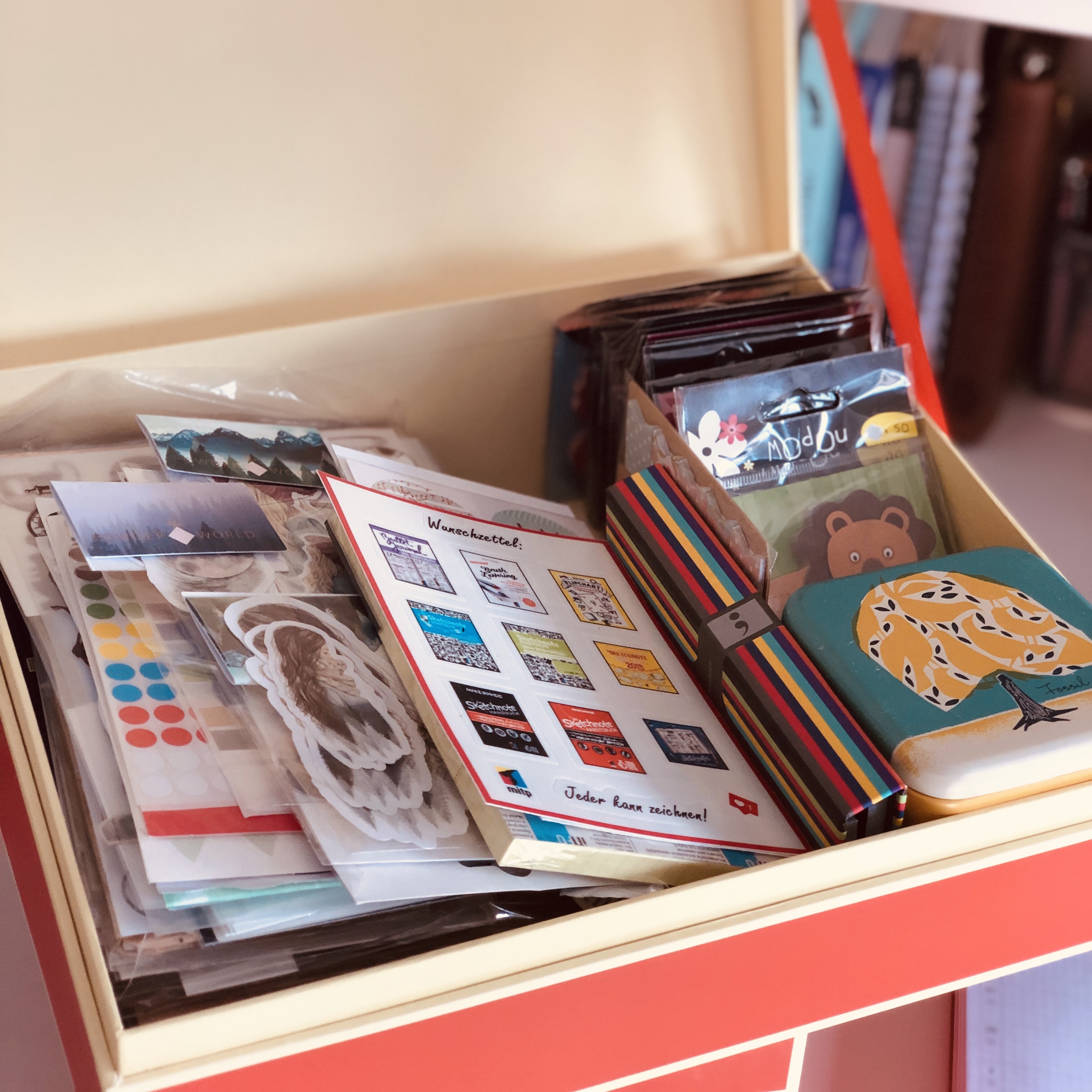 Für weiteren „Kram“ habe ich noch die durchsichtigen Boxen der Ferrero Rocher zweckentfremdet. Sie sind breit genug für A6 Papier und sehen hübsch aus im Regal.