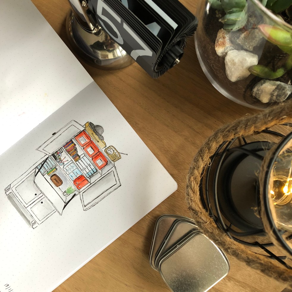 Ein Konzept musste her – eine Vision, wenn man so will, von dem, was es am Ende werden soll. Es hilft eine Liste zu schreiben oder kurz mit einigen Strichen den Kasten aufzuzeichnen und ungefähr aufzuzeichnen was man sich vorstellt und wo was Platz finden darf. Ok, ich war etwas übermotiviert und habe meine Vorstellung gleich in eine Zeichnung umgesetzt. Auf einmal war klar, was ich brauche und so fiel es mir wesentlich leichter auch Dinge, die ich nicht mochte…., die Fehlkäufe.. oder Dinge die schon seit teilweise vielen Jahren nur herum lagen, einen neuen Besitzer zu suchen. In meinem Fall haben die Kinder des Nachmittagshorts meines Sohnes eine riesen Gaude mit Papieren, Stempeln, Stiften, billigen Washis, Stickern und Krimskrams. Dort durften auch gleich meine alten Kartons, die so wahllos zusammen gekauft wurden einen neuen Platz finden. Nichts ist weg geschmissen worden. Alles wird zumindest noch verbastelt. Das gab mir ein wahnsinnig gutes Gefühl und so konnte ich befreit mein Vorhaben umsetzen.