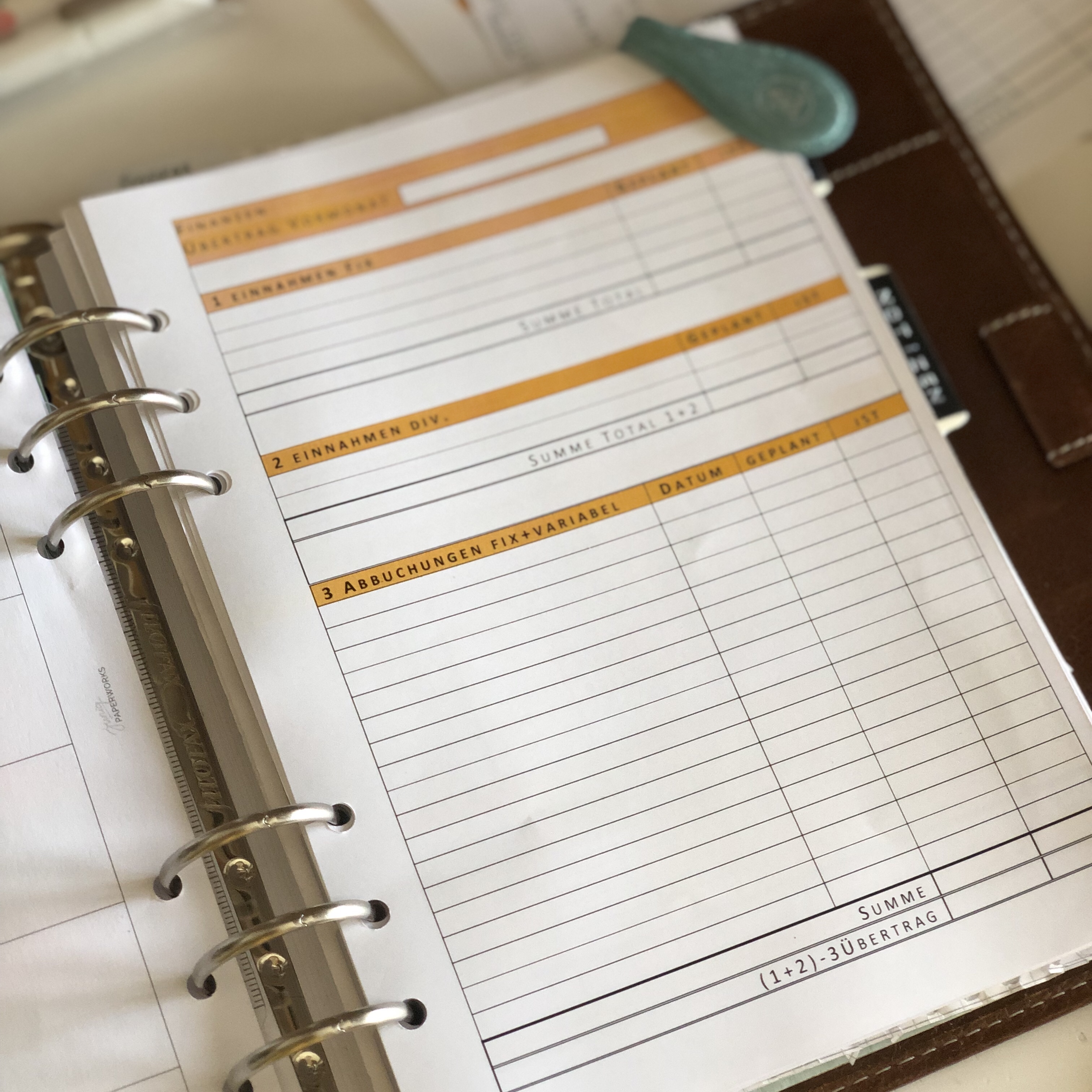 Zuerst Jahresübersicht mit ALLEN Einnahmen und Ausgaben – Fixe sowie „zu erwarten“ als Schätzwert. Weiter wird das Monat detaillierter geplant und fixe Kosten abgezogen. Anschließend die „zu erwartenden Kosten“ entweder überschlagen und Bar als Kuvert ausgeben oder in einer Liste, die mit dem geplanten IST Kontostand beginnt, erfassen.