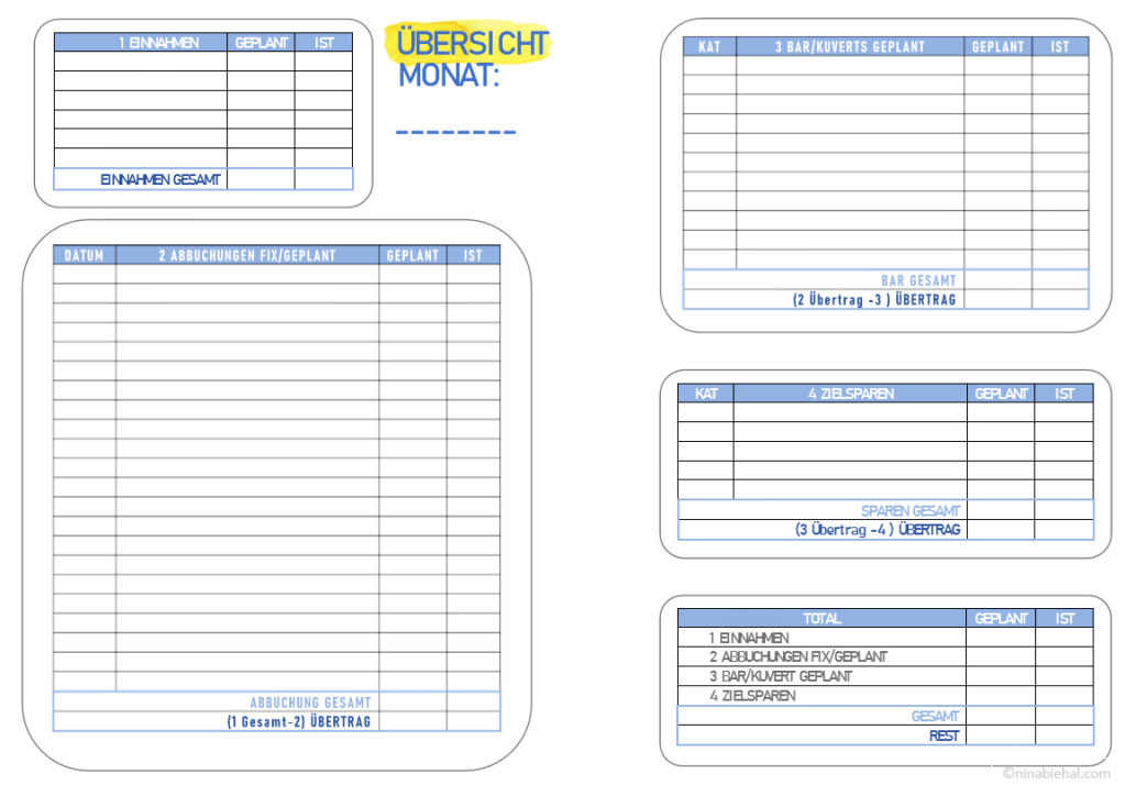 2. eine Übersicht mit den Einnahmen des Monats, allen fixen Ausgaben (=Ausgaben die ich voraus planen kann) und den Kuvert-Kosten