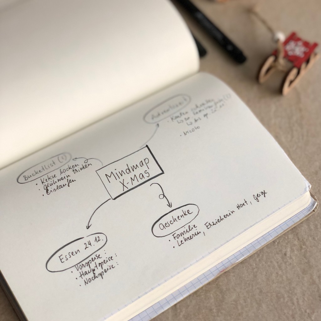 Sehen wir Weihnachten kurz nicht als Fest sondern als Projekt. Und dann machen wir uns eine Mindmap. Kennst du das? Du setzt das Hauptthema in die Mitte.. dann brichst du es herunter in einzelne Unterthemen.. Auf diese wieder gehst du detaillierter ein. Bei bestimmten Dingen kannst du hier noch einmal so weit ins Detail gehen, dass du klare Punkte oder bestimmte Ideen schon definierst..