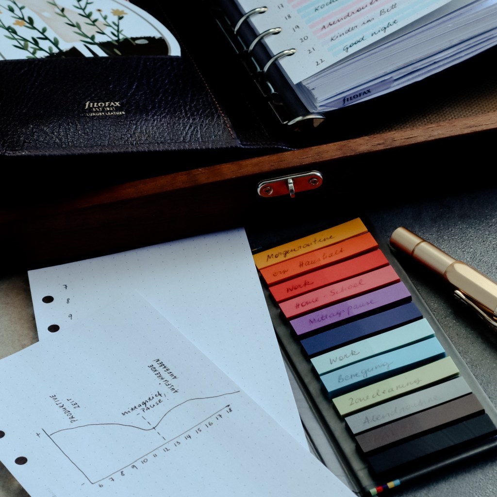 Ich habe mir meine Abschnitte auf Page-Flags notiert und kann so noch etwas besser justieren. Natürlich kann man es auch ins BulletJournal übertragen oder einfach auf Klebezettelchen auf dem Kühlschrank – für alle gut Sichtbar – unterbringen.