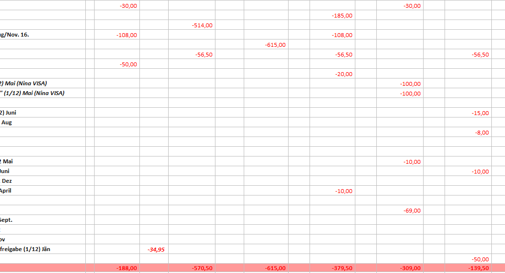 Ich habe alle unsere jährlichen/halb jährlichen/ vierteljährlichen Kosten durch gerechnet und auf das Monat als Gesamtsumme zusammen gelegt. Das geht am Einfachsten mit einem Excel Sheet. Man kann hier schnell die Kosten ändern und erhält im direkten Moment die neue Summe.