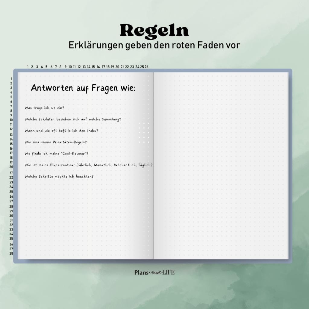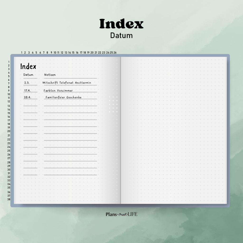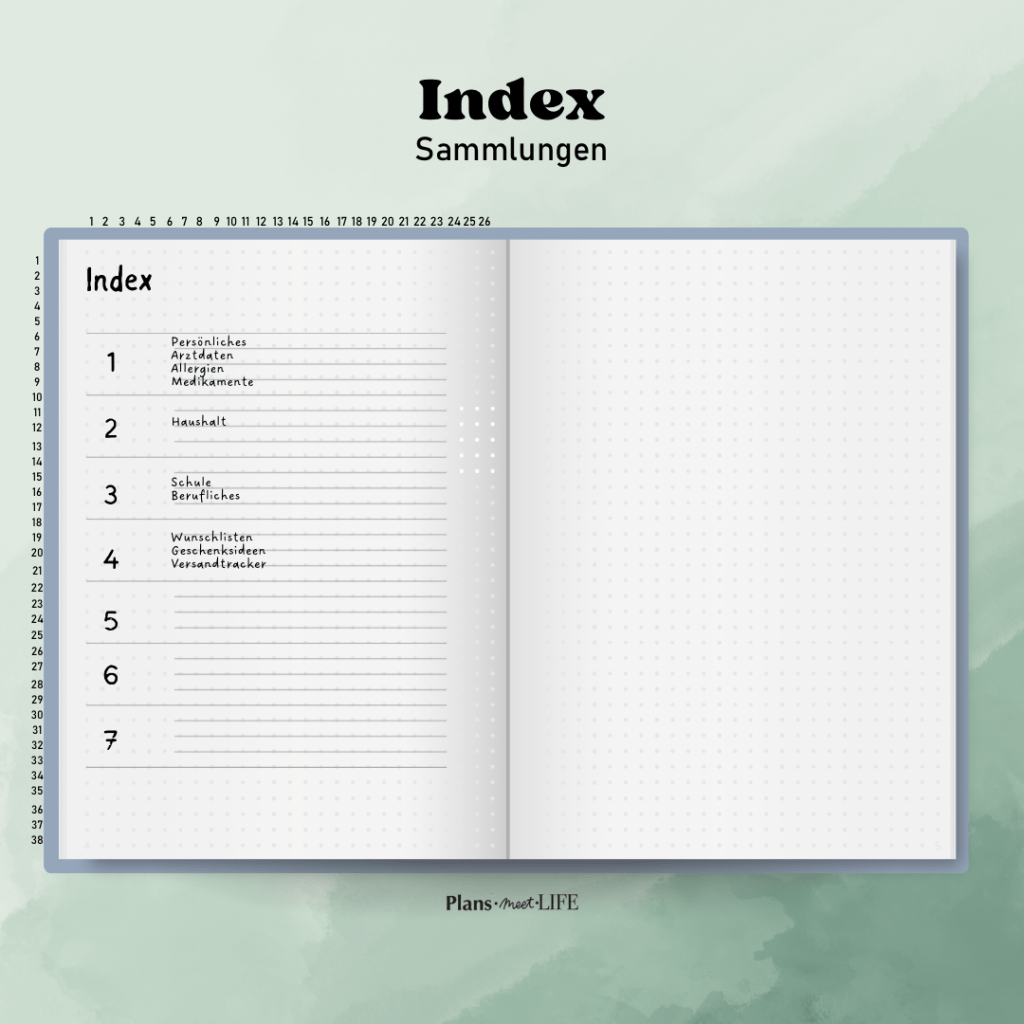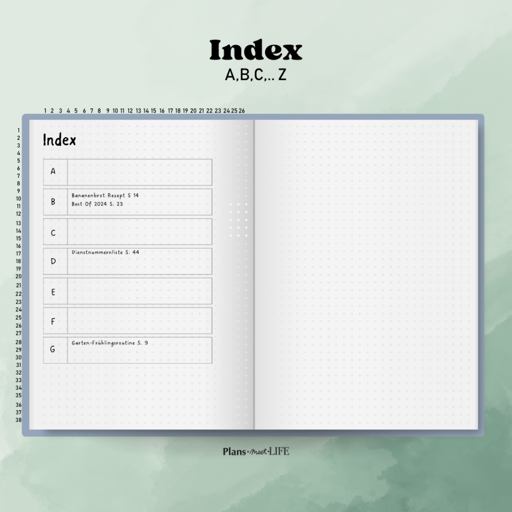 Übersichtlichkeit: Ein Index hilft dir, den Überblick über deine Notizen, Listen und Pläne zu behalten, besonders wenn dein Journal umfangreicher wird.