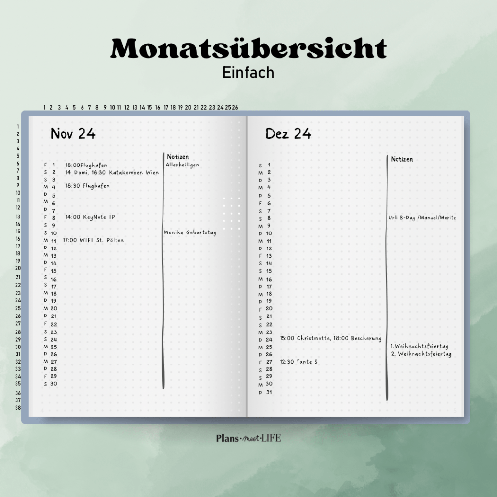 Monatsübersicht: Eine Monatsübersicht bietet einen umfassenden Überblick über den gesamten Monat. Sie ist ideal für die langfristige Planung und hilft dir, wichtige Termine und Ereignisse im Voraus zu sehen. Allerdings kann sie weniger detailliert sein und eignet sich weniger für die tägliche Mikroplanung.