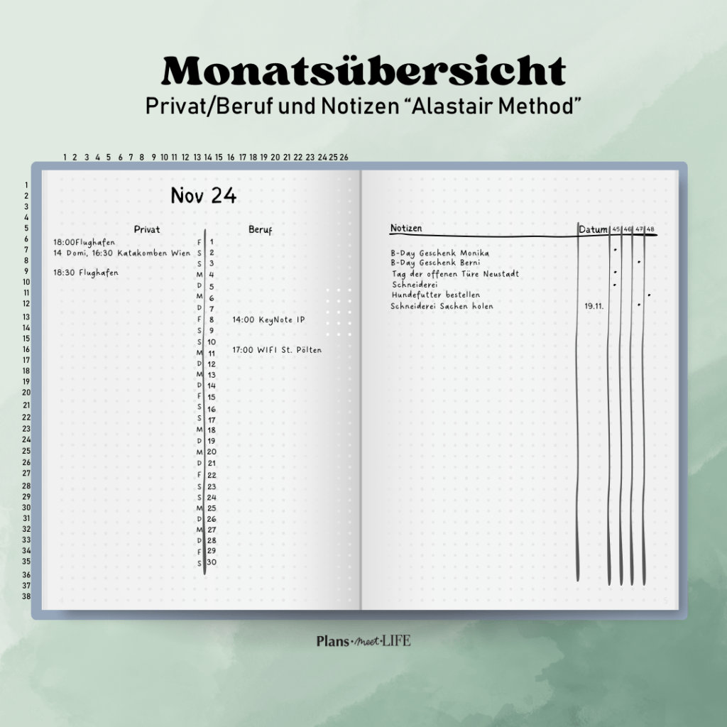 Fazit: Beide Übersichten haben ihre eigenen Vorteile und Nachteile. Die Wahl zwischen einer Wochen- und einer Monatsübersicht hängt von deinen individuellen Bedürfnissen und deinem Planungsstil ab. Eine Kombination aus beiden kann dir helfen, sowohl den Überblick zu behalten als auch detailliert zu planen.