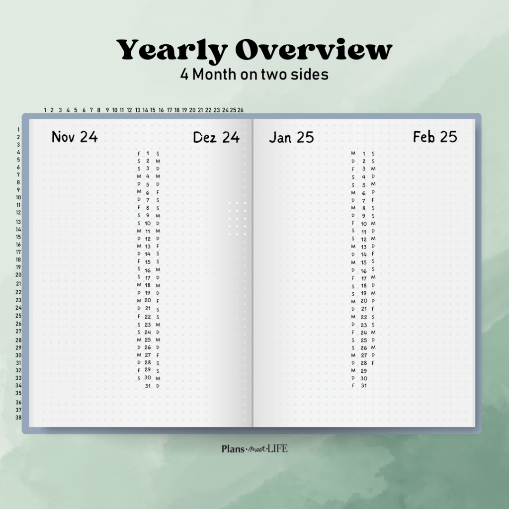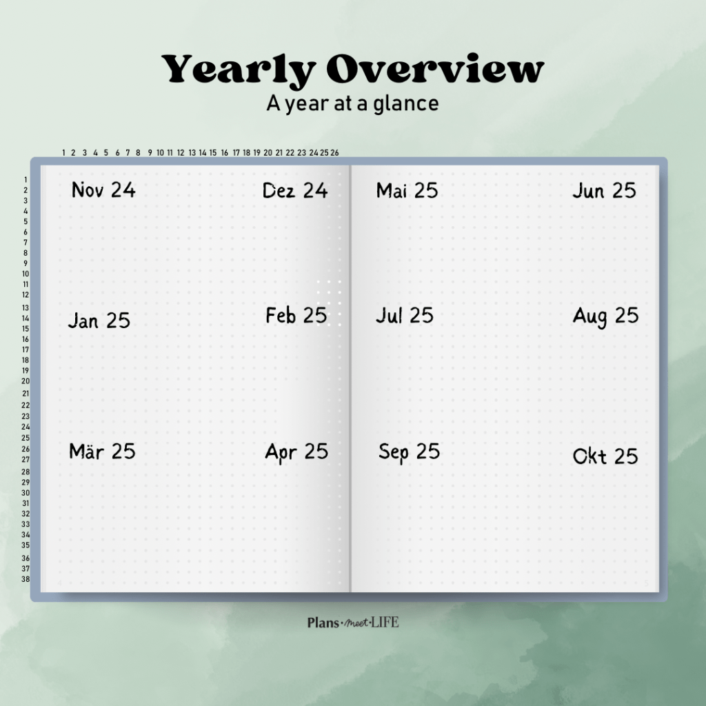 Aber das ist noch nicht alles. Die Jahresübersicht dient dir auch als Index für dein Bullet Journal. Du kannst wichtige Ereignisse und Notizen markieren und später leicht wiederfinden. Das spart dir Zeit und macht dein Bullet Journal noch effektiver. Stell dir vor, du suchst eine Notiz von vor ein paar Monaten – mit der Jahresübersicht findest du sie im Handumdrehen.