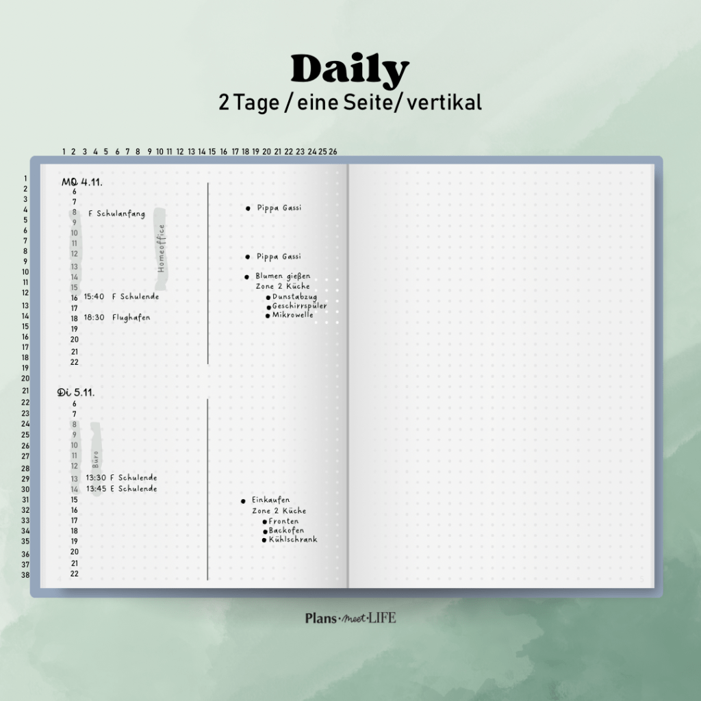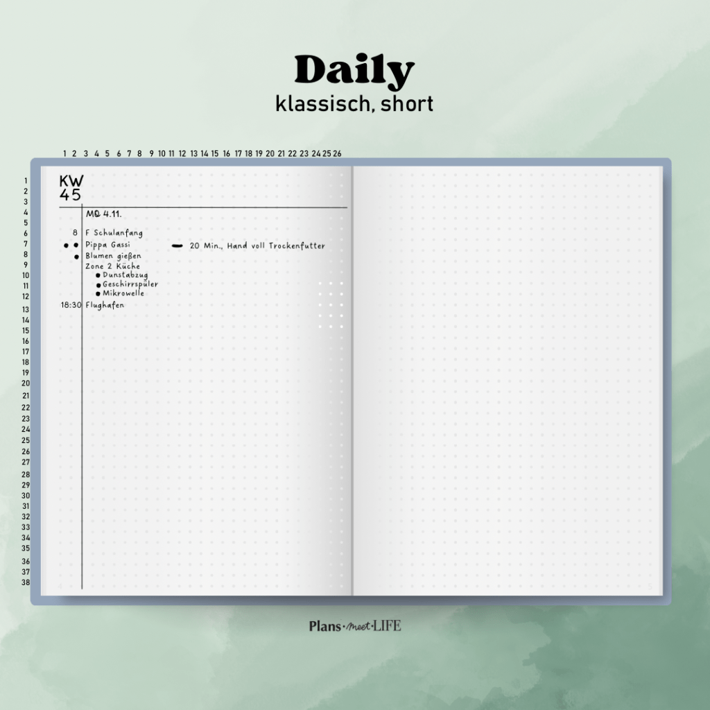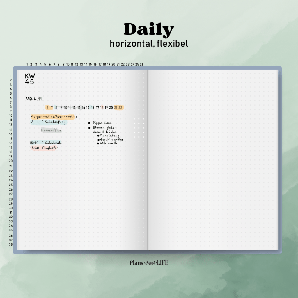 Flexibilität: Lass genug Platz für spontane Notizen oder Änderungen. Ein flexibles Design hilft dir, auf unvorhergesehene Ereignisse zu reagieren.