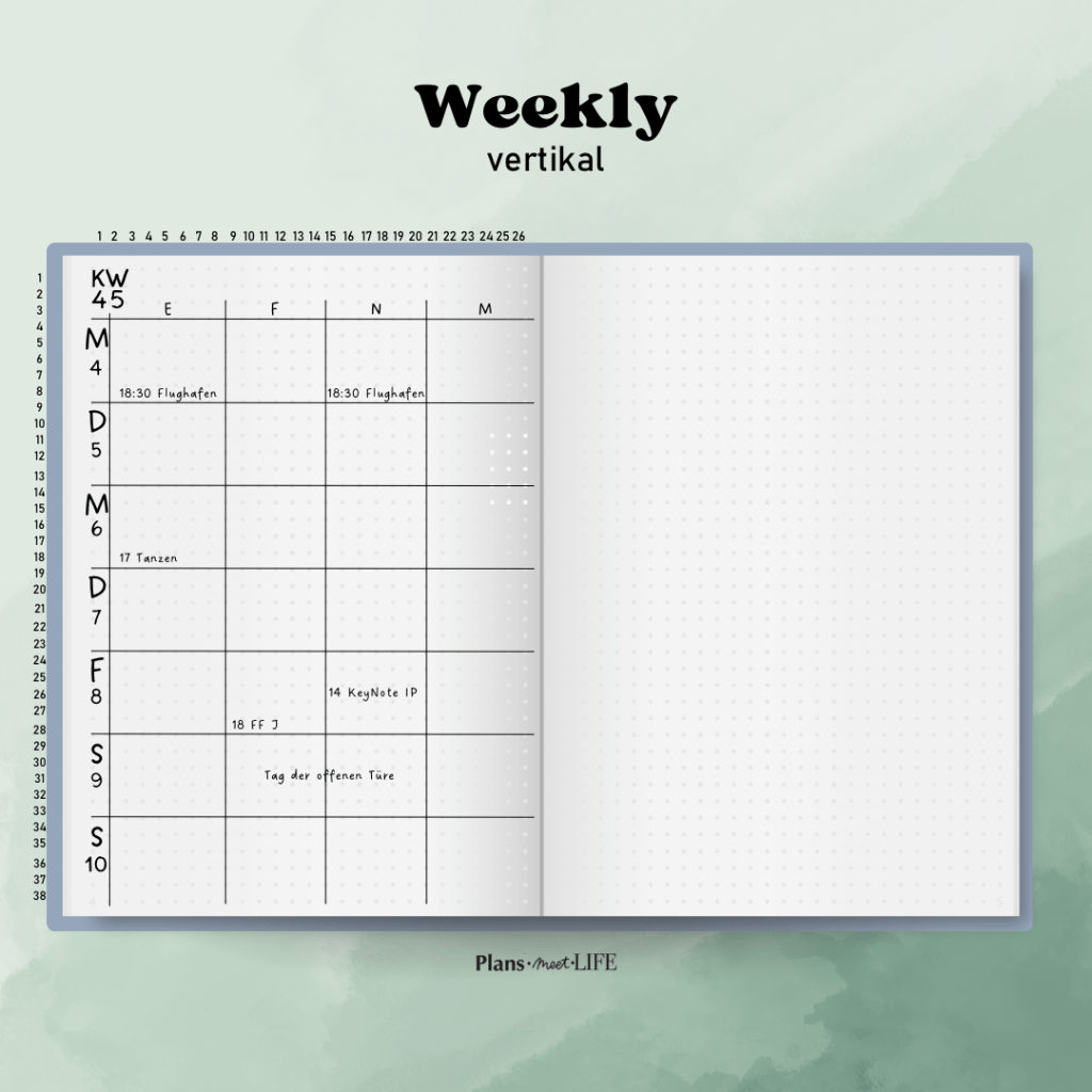 Detaillierte Planung: Eine Wochenübersicht ermöglicht eine detaillierte Planung deiner Woche. Du kannst tägliche Aufgaben, Termine und Ziele festhalten, was dir hilft, den Überblick zu behalten und nichts zu vergessen.