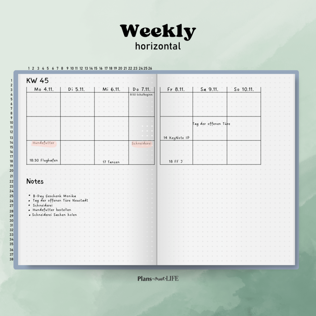 Mikroplanung: Die Wochenübersicht ist ideal für die Mikroplanung. Du kannst tägliche To-Do-Listen erstellen und kleine Aufgaben festhalten, die in einer Monatsübersicht möglicherweise untergehen würden.