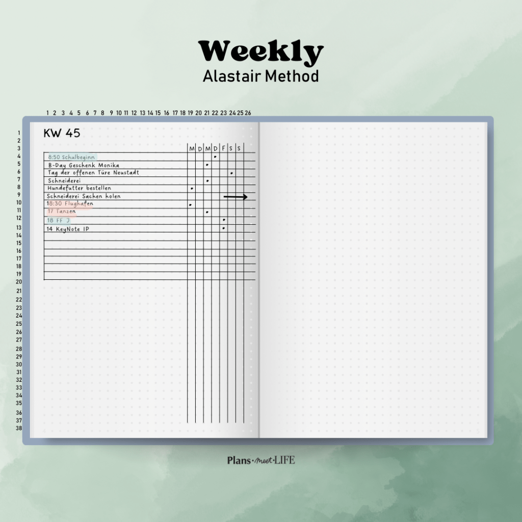 Platzbedarf: Eine Wochenübersicht benötigt mehr Platz im Bullet Journal. Wenn du viele Details festhalten möchtest, kann das schnell zu einem vollgepackten Layout führen.